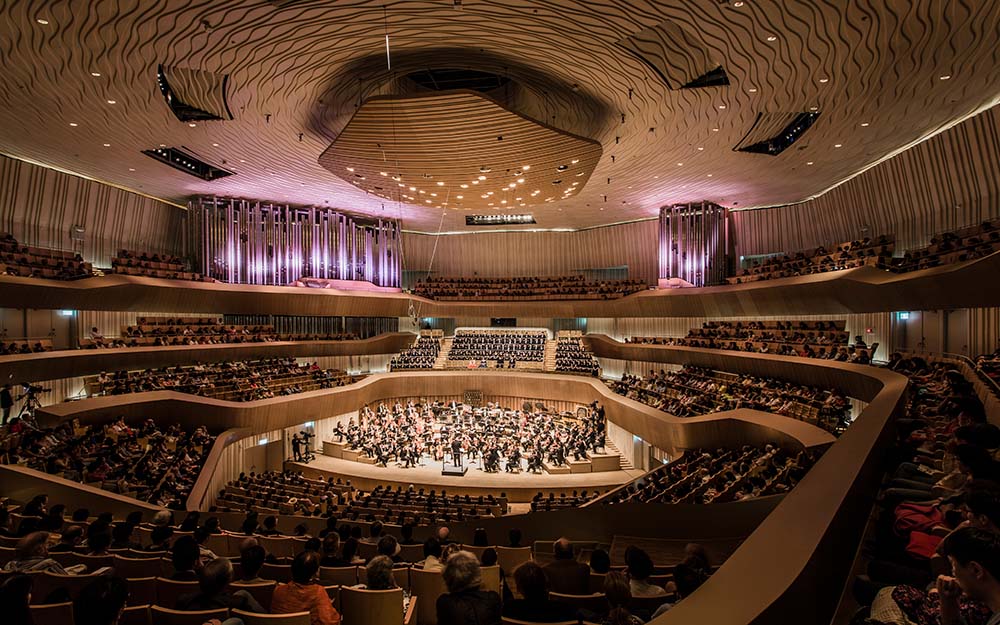 The concert halls, with their windowless facades, contrast with the central cube covered in glass, allowing a peek into the inner workings of performances. The aim of this see-through design is to create an open and inviting arts center. Moreover, features like the "public loop" offer glimpses behind the scenes, connecting visitors to the lively performances